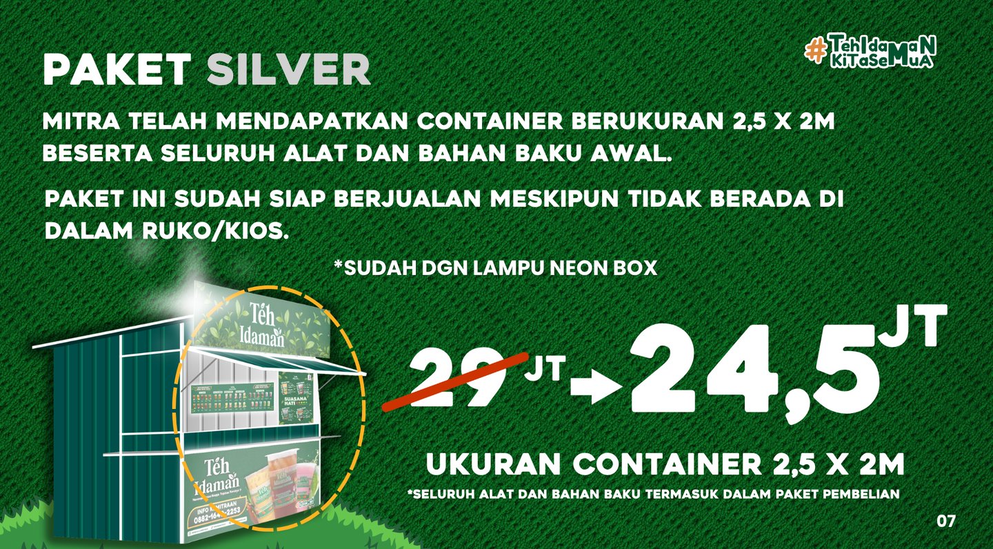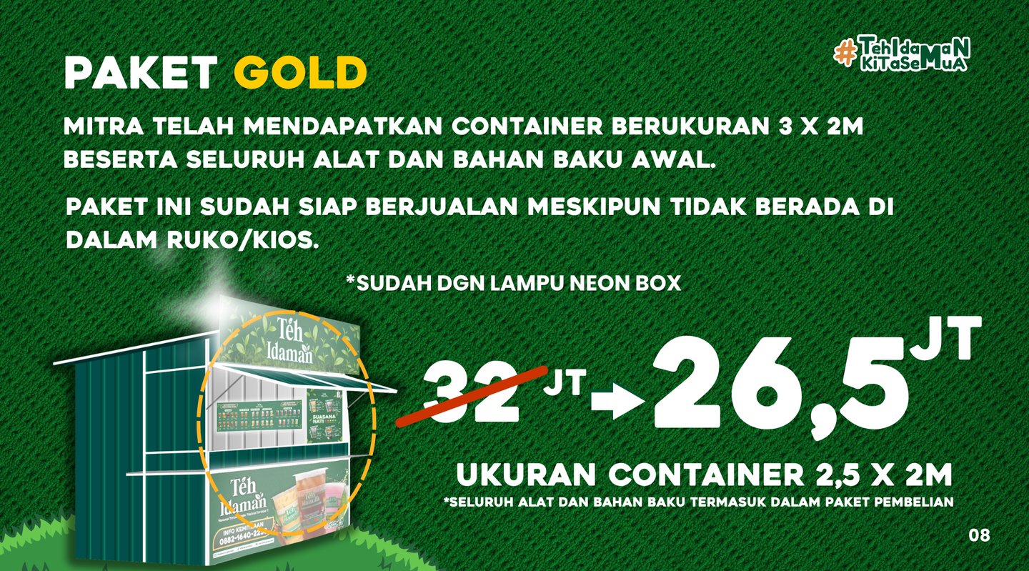 PT Idaman Anak Bangsa berdiri sejak Agustus 2023, merupakan pelopor dan pioneer kemitraan minuman es teh cup jumbo dengan harga Rp2.500 yang berlokasi di Yogyakarta, kami menyediakan jasa kemitraan atau franchise kepada para calon mitra. Produk kemitraan yang kami tawarkan adalah “Teh Idaman” yaitu UMKM yang bergerak di segmen minuman kekinian. Tepat setahun setelah PT Idaman Anak Bangsa berdiri, terdapat lebih dari 400 mitra kami telah tersebar di beberapa provinsi seperti Yogyakarta, Jawa Tengah, Jawa Timur dan Jawa Barat.
